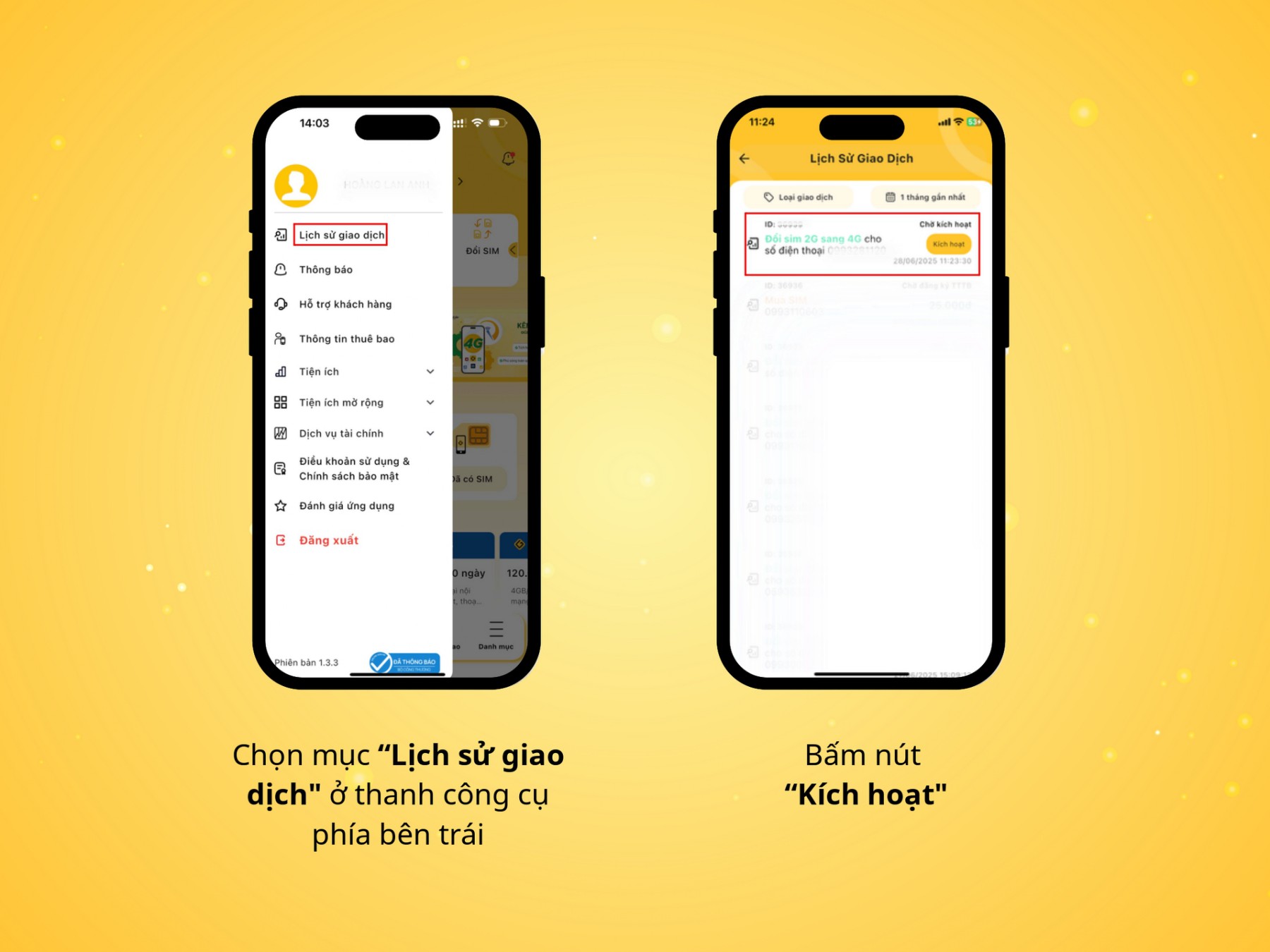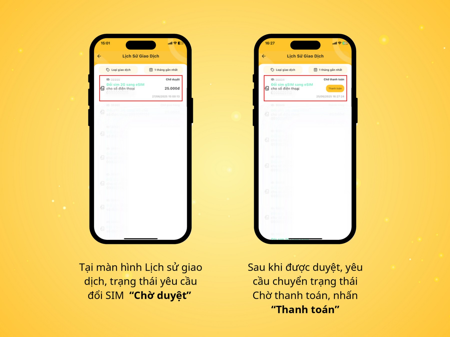 - Yêu cầu đổi SIM sẽ hiển thị trạng thái “Chờ duyệt” trong mục Lịch sử giao dịch.